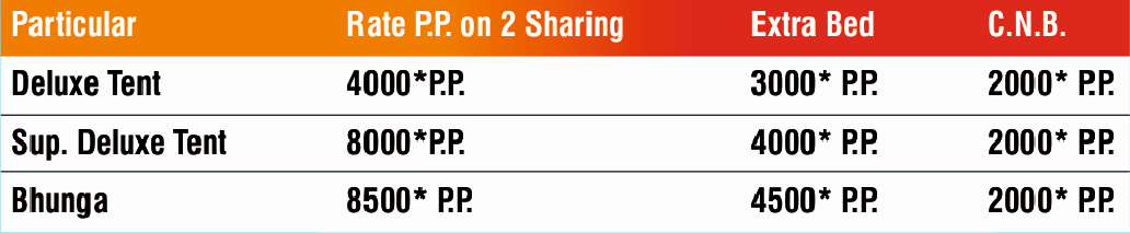 Arrive @TENT CITY check in to your respective Tents Lunch @ Tent City Noon Free Time for Leisure. 1500 hr. Get Ready for local Sight seeing - Ansuya Temple, Joona Suraj Deval, Farm Visit - High tea @ Farm to enjoy the tradition and be part of it. Evening back to Tent City after dinner Cultural Program@TentCity. NIGHT @ TENT